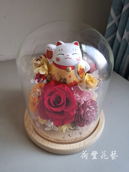 花材:精緻招財貓、永生玫瑰、索拉貝力、永生繡球花、乾燥木滿天星、十字尤加利果
